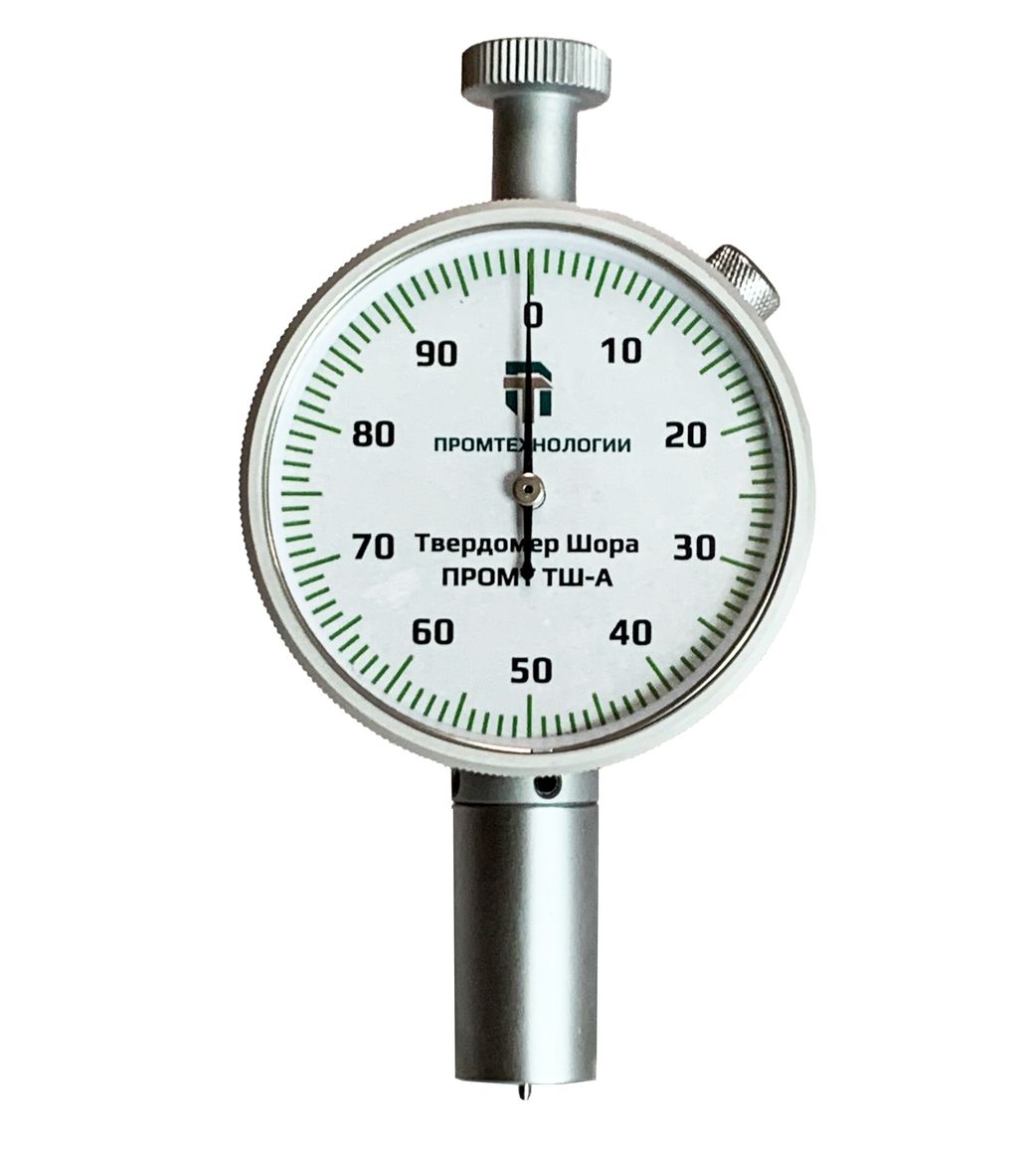Это простой и надежный механический прибор с металлическим корпусом, индикатором часового типа, поворотным циферблатом для корректной установки нуля и удлиненной контактной площадкой облегчающей применение дюрометра. Внутри устройства установлена тарированная пружина обеспечивающая требуемое усилие на индентор специальной формы из закаленной стали и механизм фиксации его перемещения. Для проведения измерения в соответствии с ГОСТ также потребуется секундомер и термометр. Твердомер Шора ПРОМТ ТШ-А (тип А) не требует специальных навыков для работы с ним и позволяет оперативно контролировать твердость мягких резины и пластиков, силикона, винила и аналогичных материалов в лабораторных и цеховых условиях.